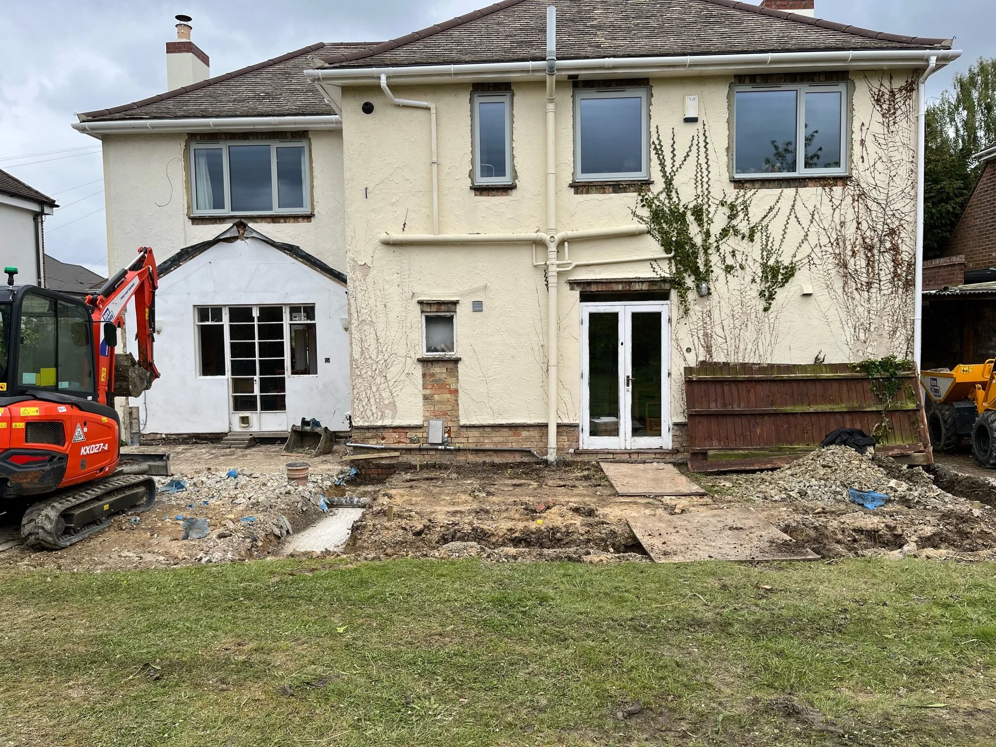 Work on the project eventually commenced after a significant delay caused by Building Control concerns regarding the soakaway system, exacerbated by the clay soil. Additionally, there were prolonged discussions with local water authorities about existing offsite connections and below-ground services. Once these issues were resolved, the foundation depths were finalized, the concrete slab was poured, and the initial courses of brickwork were laid.