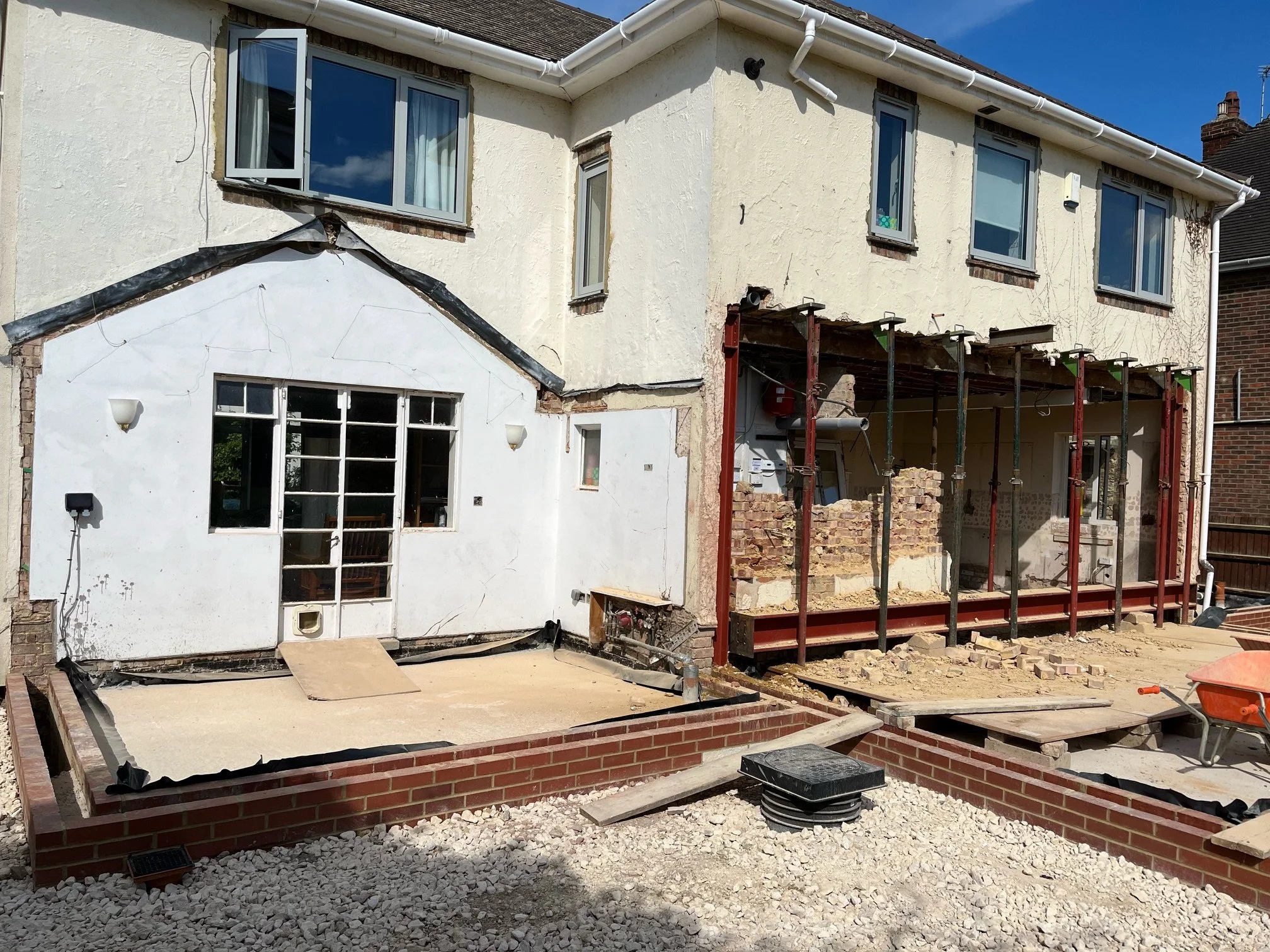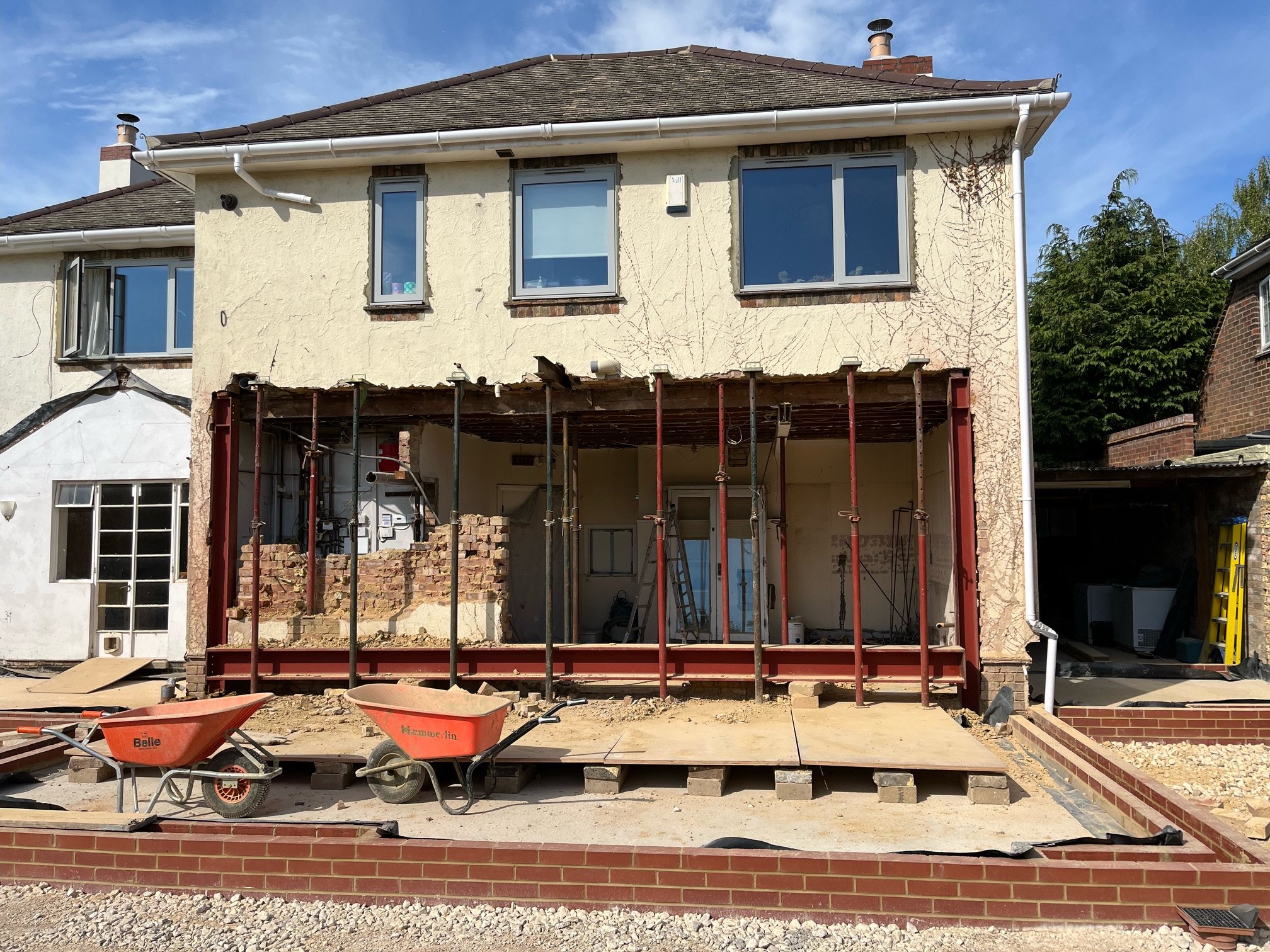 The next major task involved opening up the rear facade of the property to accommodate a large steel beam. This beam was crucial for supporting the wall above the new opening, which would become part of the expansive open-plan kitchen and dining area. Additionally, as part of the thermal upgrades to the existing property, the old first-floor windows were replaced with new double-glazed, A+ rated windows to enhance energy efficiency.
