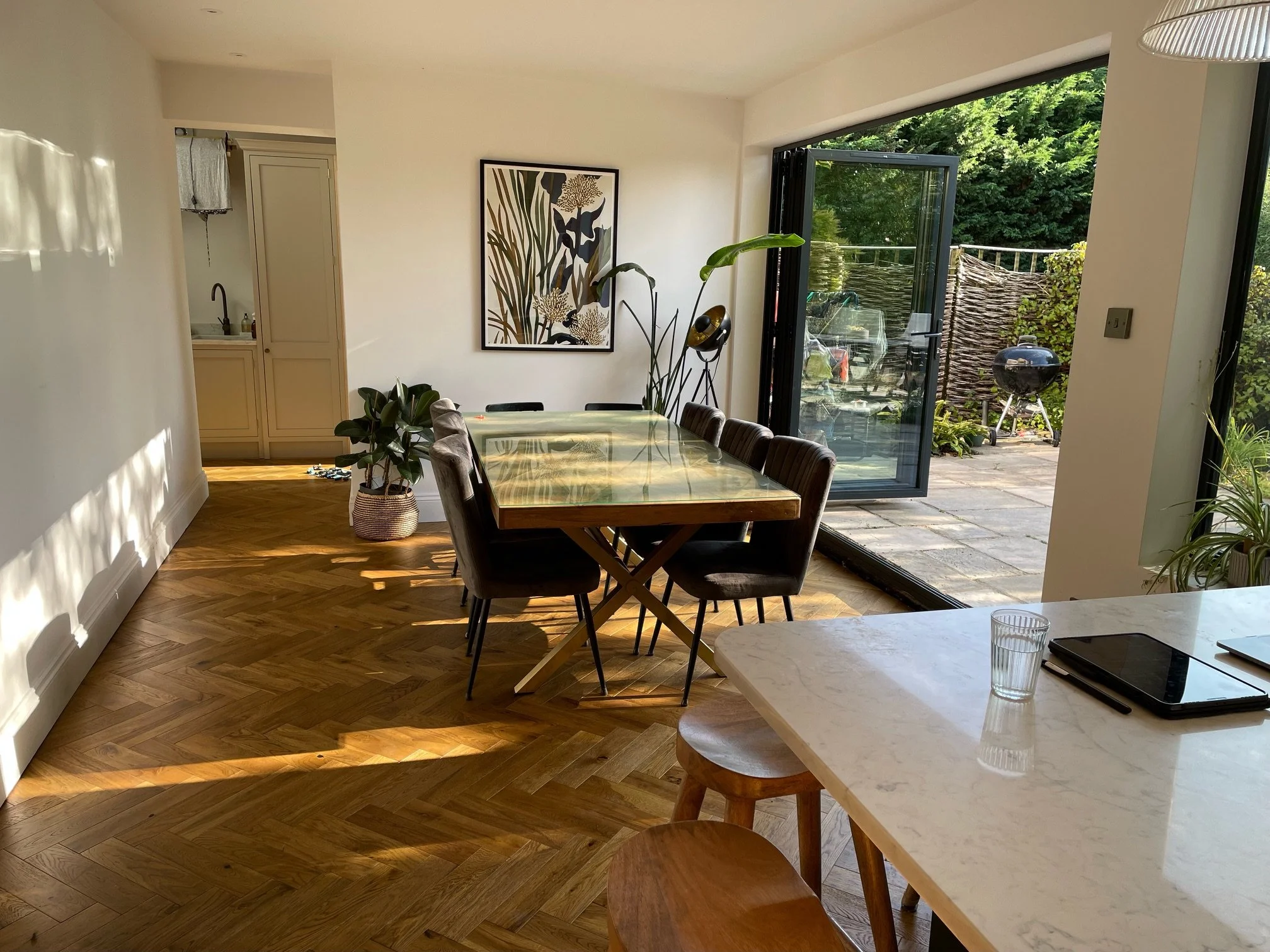 The client desired a large open plan kitchen/dining space for their growing family, and a more social space for entertaining guests, with also a utility space, shower room and a flexible home office